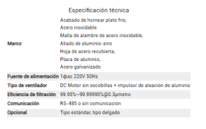 Estándar de parámetro: Nivel de ruido ≤58dB, velocidad promedio de viento de superficie 0.45m/s ± 20%, volumen de aire 1000m3/h,